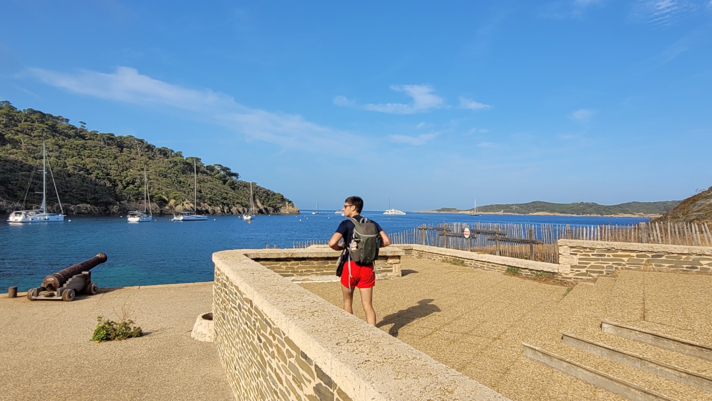 We were told that one of the best ways to explore Porquerolles is by bike, given the numerous trails that span the island. Sadly, when we arrived on the island it was raining so we decided to just walk underneath the pine and eucalyptus trees lining the trail to Plage Notre-Dame, the most highly recommended beach. To our joy, the rain subsided after about an hour or so, and we were left with crystal-clear water gleaming in the sun. Once again, the views were stunning and there was a very lively atmosphere as many boats anchored themselves along the beach for the day.